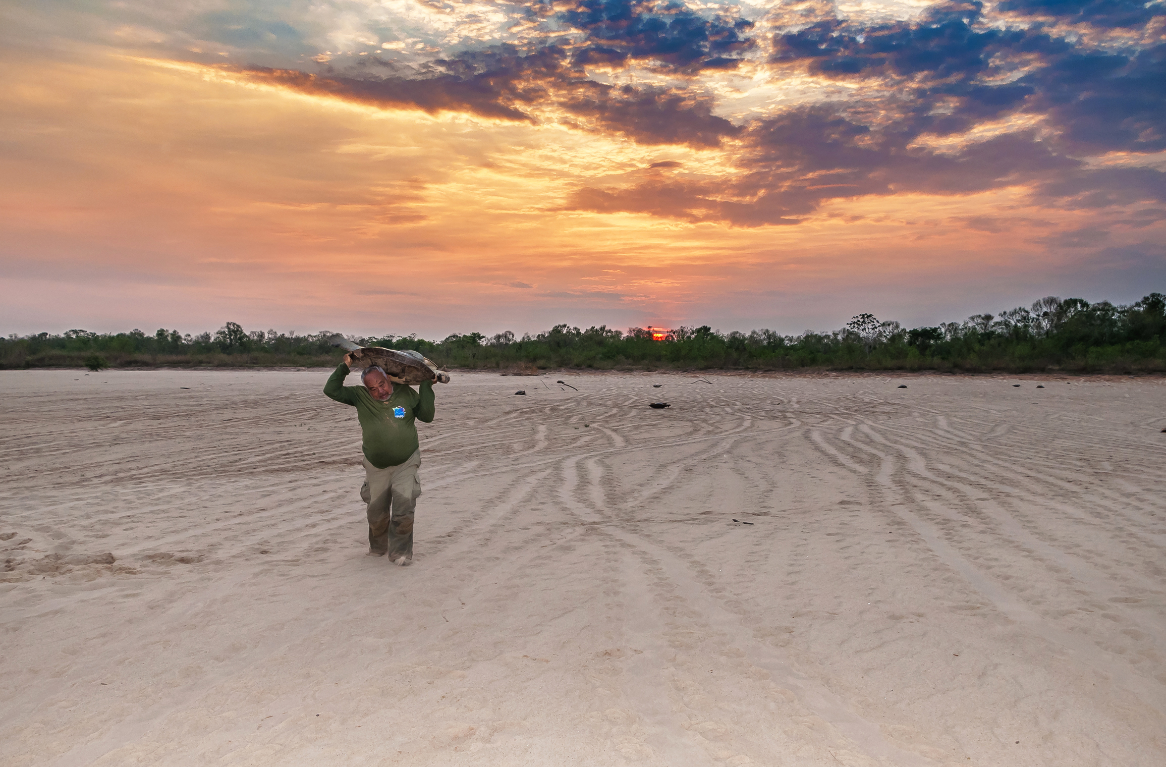 Durante o amanhecer integrante do Projeto Quelônios da Amazônia transporta exemplar de Podocnemis expansa para a tomada de medidas biométricas (Praia da Onça, Rio Araguaia). "CONCURSO NACIONAL DE FOTOGRAFIA DO IBAMA"